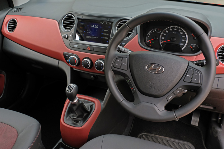 There are now six versions, three with the 1.0-litre motor and three with the 1250. For more details on the new range, click over to our launch report. Our test vehicle was the new top model, a 1.25 Glide with five-speed manual gearbox. To create it, Hyundai took its 1.25 Fluid m/t (still available and now with optional satnav) and added some features – combination faux leather and fabric upholstery, leather covered steering wheel and shift knob, LED daytime running lights, gear shift-point indicator and rear parking distance alarm.