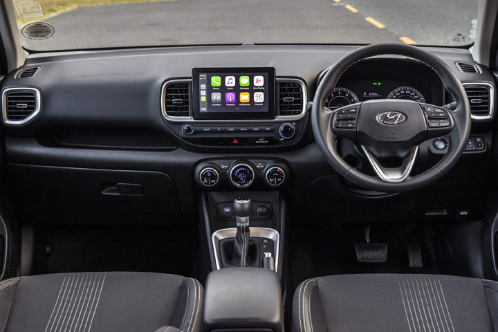 The company’s new entry-level SUV, it’s just shy of four metres long. Shorter than Kona by 170 mm, it’s also 30 mm narrower, 40 mm taller, offers 11 litres less boot space and has a slightly smaller fuel tank. It isn’t as luxuriously equipped either. But it weighs 148 kilograms less so, equipped with the same 88-kW engine, Venue is a touch quicker, faster and lighter on fuel.